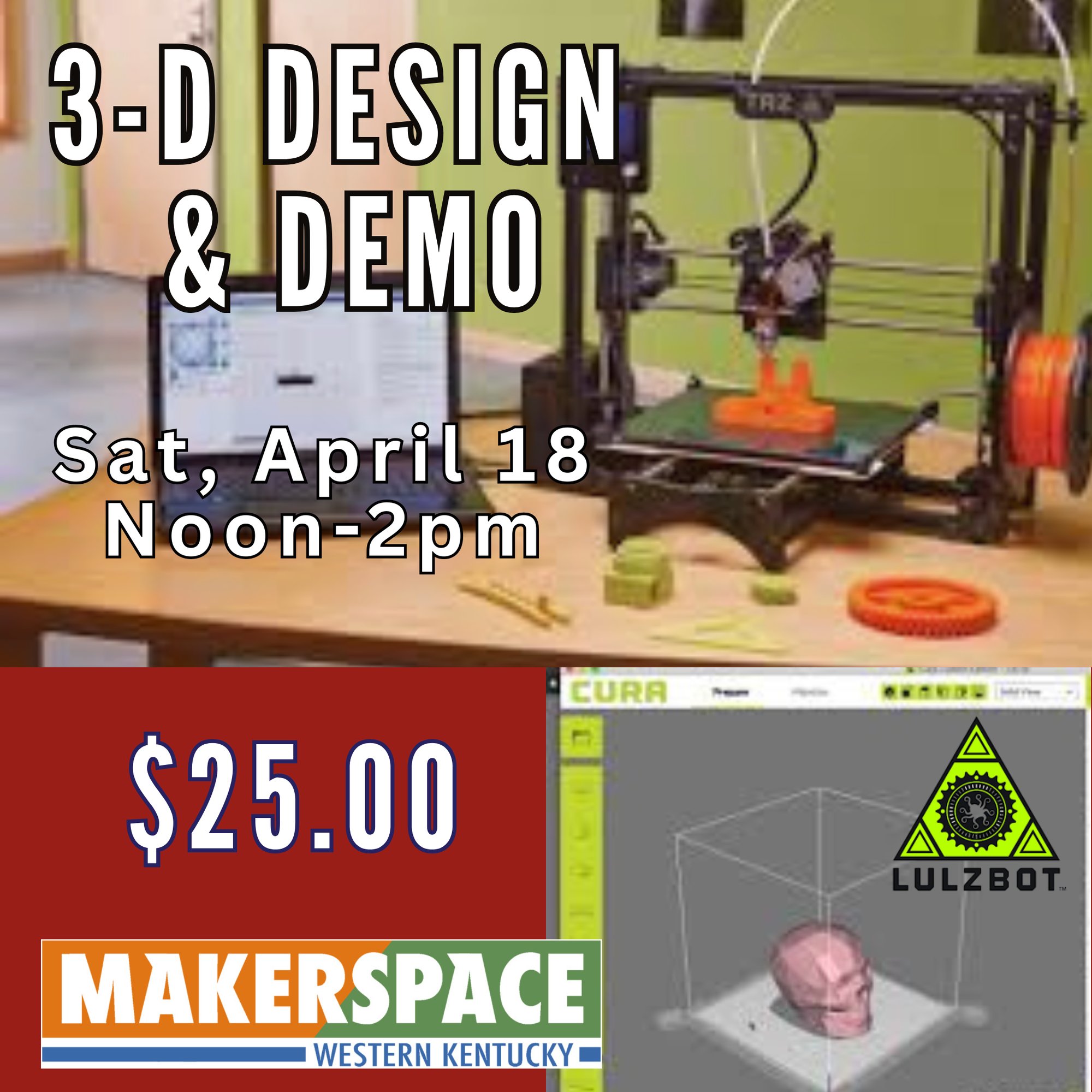 What: Learn to use the Cura software (specific to LulzBot) and get tips on importing and adjusting files to your specifications. Paper copies of instructions will be included. However, due to printing time, you will not go home with an item.