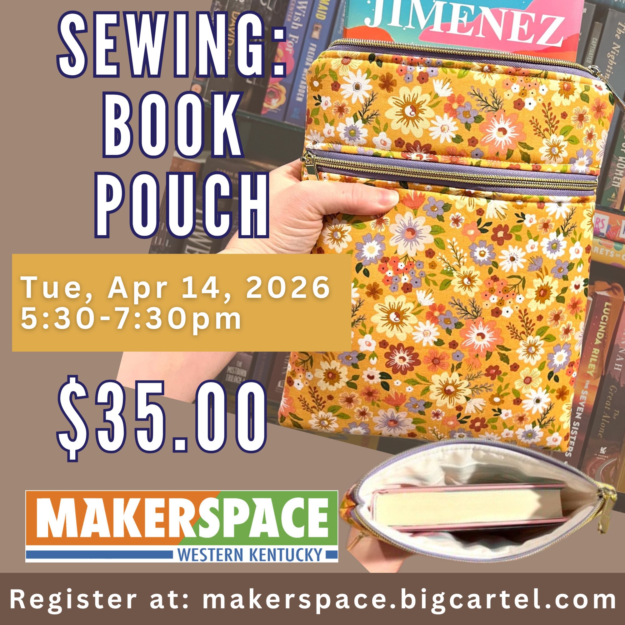 Create a book pouch with a pocket and become more confident as learn how to sew zippers! Rebecca Travis of Knot, Needle, and Thread of Hanson will guide you through the process to make this useful and beautiful item.